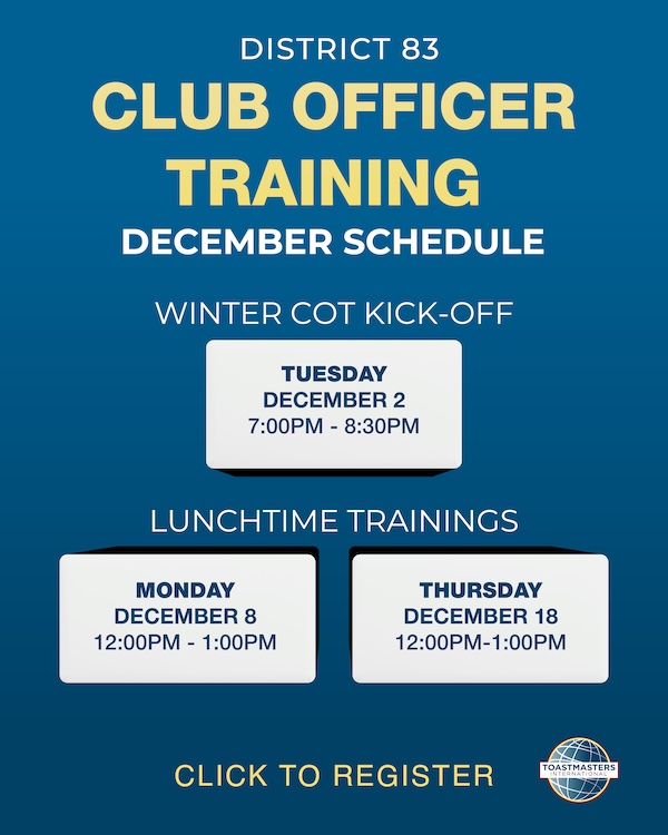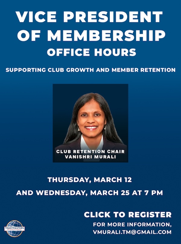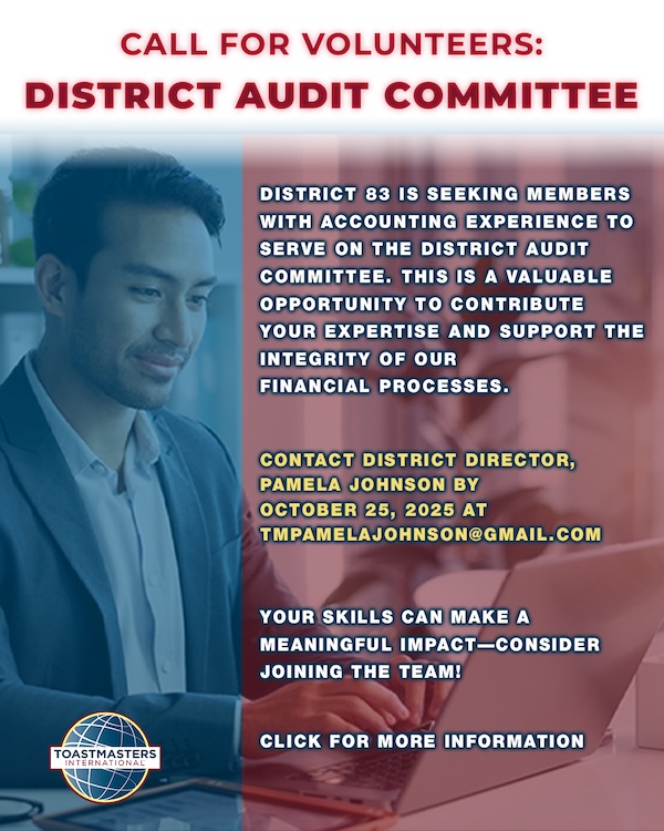 The information on this Web site is for the sole use of Toastmasters’ members, for Toastmasters business only. It is not to be used for solicitation and distribution of non-Toastmasters material or information. The names “Toastmasters International,” “Toastmasters,” and the Toastmasters International emblem are trademarks protected in the United States, Canada and other countries where Toastmasters clubs exist. Unauthorized use is prohibited.